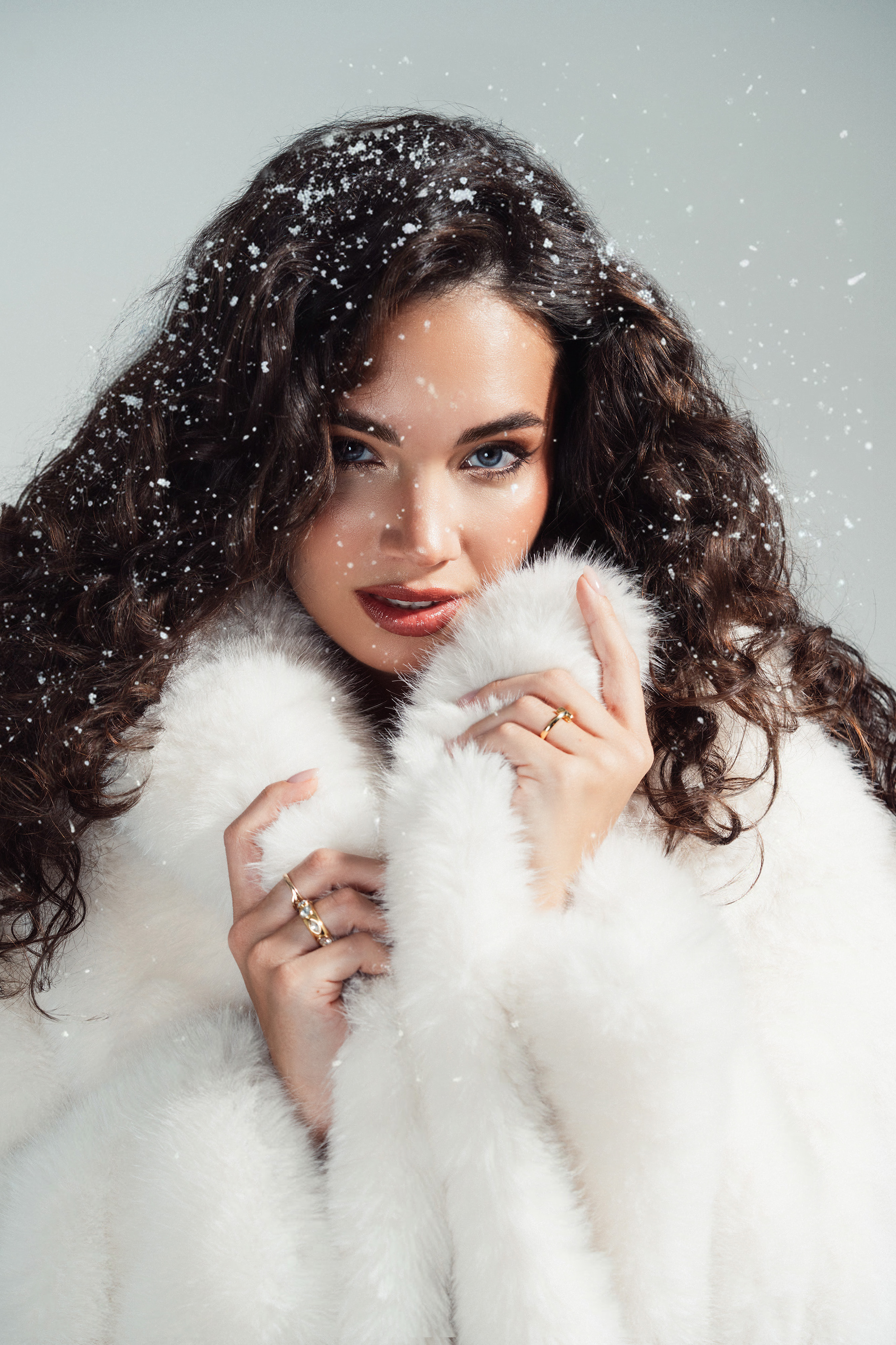 winter fashion photoshoot in the studio with snow